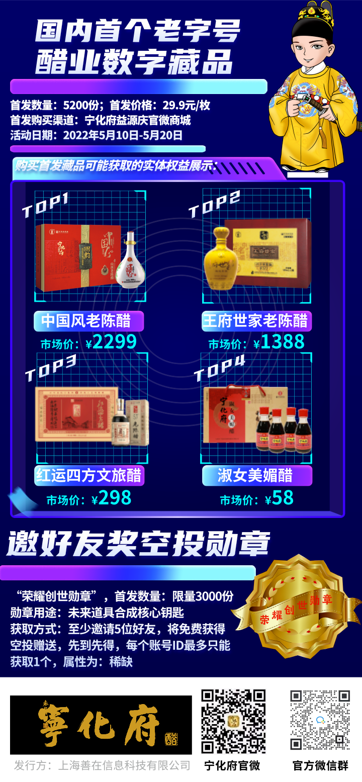 当元宇宙、区块链、数字藏品这些曾经难懂的概念,被大众日益熟知的时候,当各大品牌在不同领域发布着自己的数字藏品时,宁化府也悄然布局起这一新战场,成为中国食醋行业数字藏品的首发品牌。